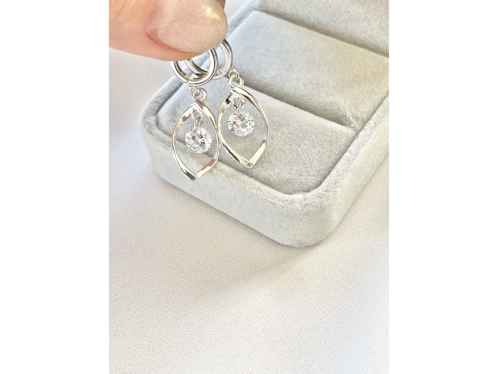 Dámske kruhové náušnice s visiacou ozdobnou časťou s jedným čírym CRYSTAL QUALITY kryštálikom. Zapínanie majú zacvakávacie, ktoré stačí zaklapnúť a drží. Náušnice sú vyrobené zo striebra 925 pri ktorom bola použitá povrchová úprava-rhódiovanie je to antioxidačná povrchová úprava šperkov. Rhódiovanie šperkov je technologický postup, ktorý slúži na ochranu šperkov pred zčernaním a stratou lesku. Rhódiované šperky sú vhodné pre ženy so sklonom k alergiám. Hodia sa na každodenné nosenie, alebo rôzne príležitosti pre ženy i dievčatá.