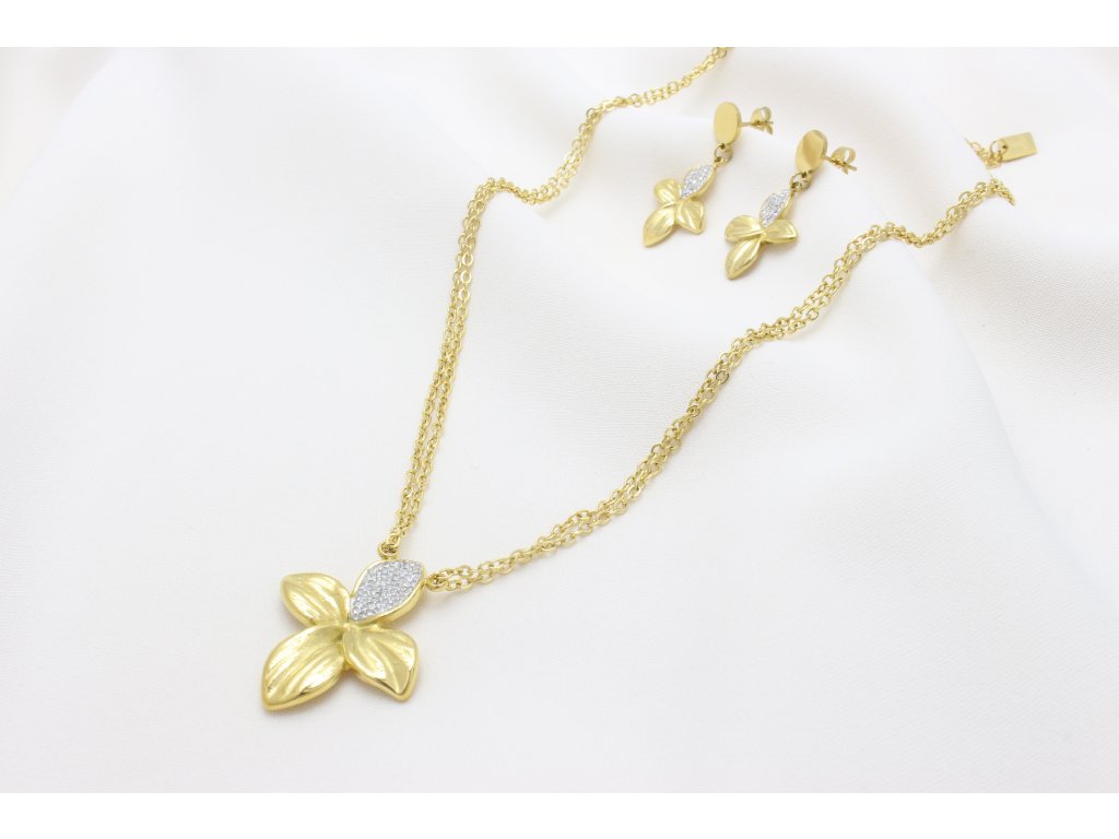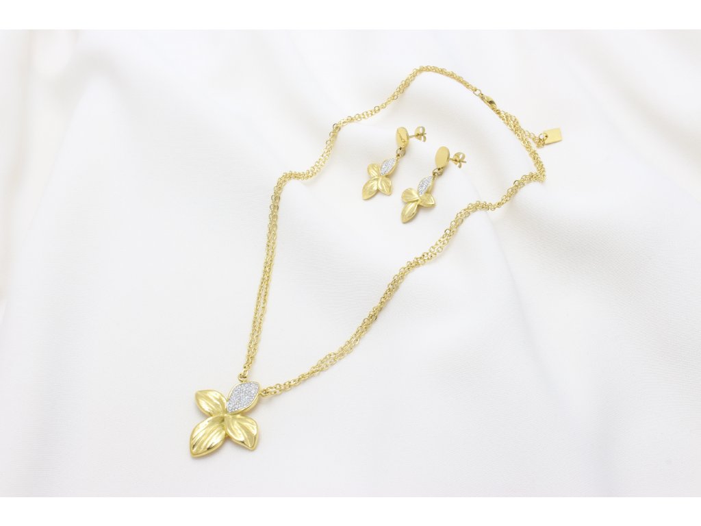Set Samantha Flowers je vyrobený z chirurgickej ocele 316L s pozlátenou povrchovou úpravou pri ktorej sa nemusíte báť zmeny alebo ošuchania farby, farba je stála. Set sa skladá z visiacich náušníc so zapínaním na puzetu a dvojitej retiazky s klasickým nastaviteľným zapínaním na karabínku. Dominantou setu sú jeho prívesky v tvare kvetu s osadenými čírymi Crystal Quality kryštálikmi na jednom lupienku. Set je ideálny na každodenné nosenie ale i na príležitostne udalosti . Zabalený v krásnej darčekovej krabičke vhodný ako darček k sviatku alebo len tak z lásky .