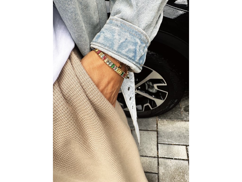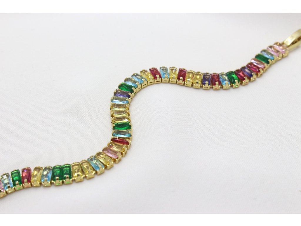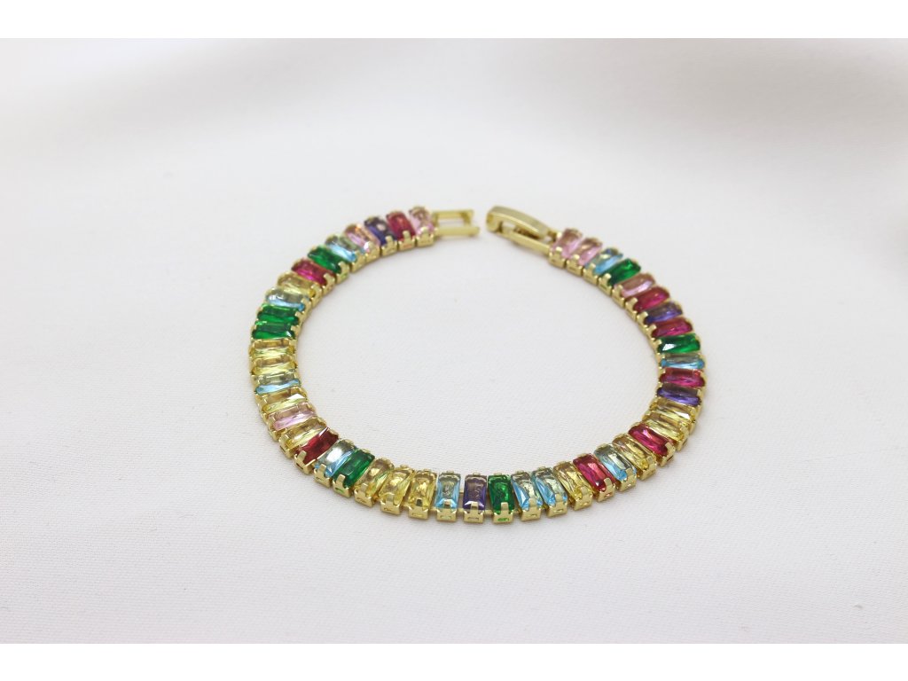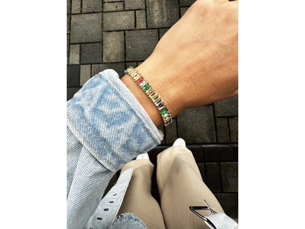 Elegantný náramok vykladaný farebnými brúsenými kryštálikmi. Vyrobený z odolnej chirurgickej ocele, ktorý vyniká pozlátenou úpravou pre dlhotrvajúci lesk - farba je stála, vodeodolná, hypoalergénna. Tento nadčasový náramok predstavuje kombináciu moderného dizajnu a klasickej elegancie, vďaka čomu je ideálnym doplnkom pre každú príležitosť. Náramok má hodinkové zapínanie. Perfektný doplnok pre každú ženu, ľahko kombinovateľný s inými náramkami či hodinkami.