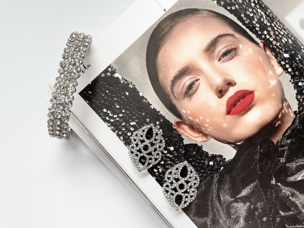 Trendový spoločenský Set v striebornom prevedení, vykladaný čírymi kamienkami