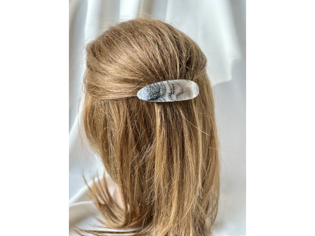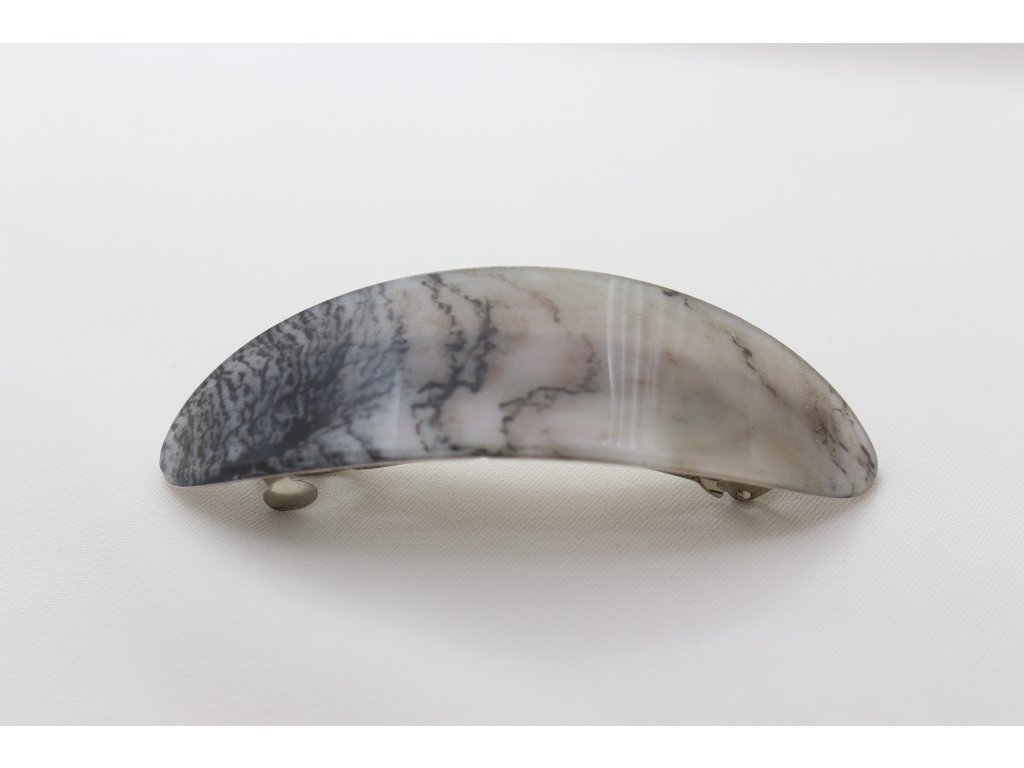 Štýlová francúzska spona v čierno-bielej farbe, pevne drží vo vlasoch. Kovový zacvakávací mechanizmus je pevný. Spona pre svoj zaoblený tvar vynikne v každom účese .